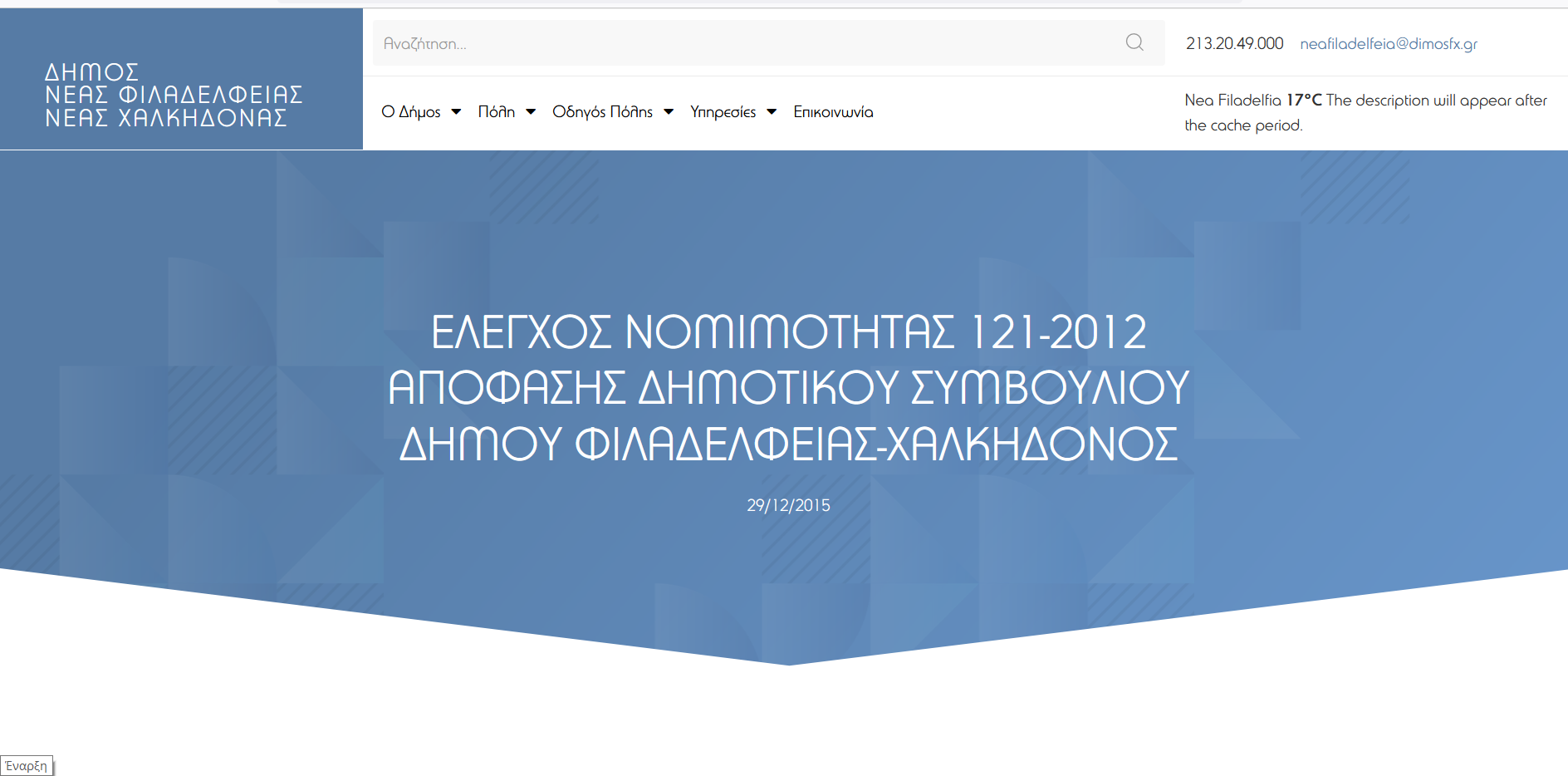 Τις τελευταίες μέρες βγήκε στον αέρα το “αναβαθμισμένο” site του Δήμου Ν. Φιλαδέλφειας – Ν Χαλκηδόνας με σοβαρές αδυναμίες και ελλείψεις. Είναι χαρακτηριστικό ότι στην πρώτη σελίδα εμφανίζονται άρθρα που αφορούν αποφάσεις του 2012 και ακολουθούν αποφάσεις του 2015 και έπεται συνέχεια. Η νέα ιστοσελίδα προπαγανδίστηκε από στελέχη της διοίκησης ως μια μεγάλη καινοτομία, η πραγματικότητα όμως είναι άλλη. Ανέβασαν το νέο site χωρίς να εξασφαλίσουν την ομαλή μετάβαση στη νέα μορφή επιλέγοντας μάλιστα και χρωματικές επιλογές που παραπέμπουν στα χρώματα του κυβερνητικού κόμματος σήμερα.