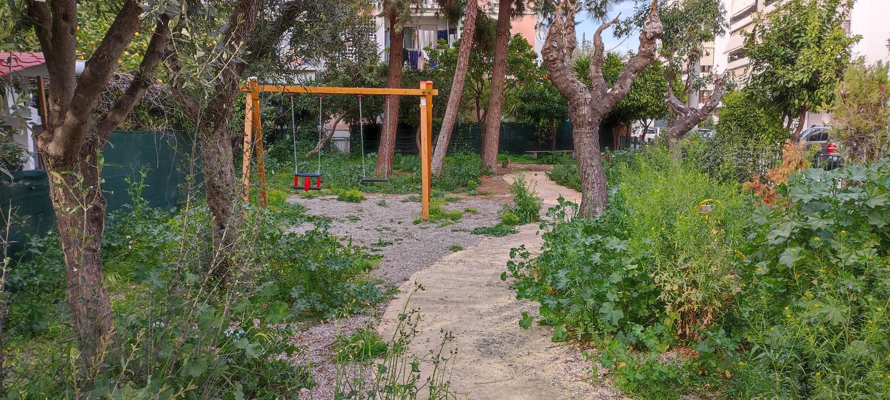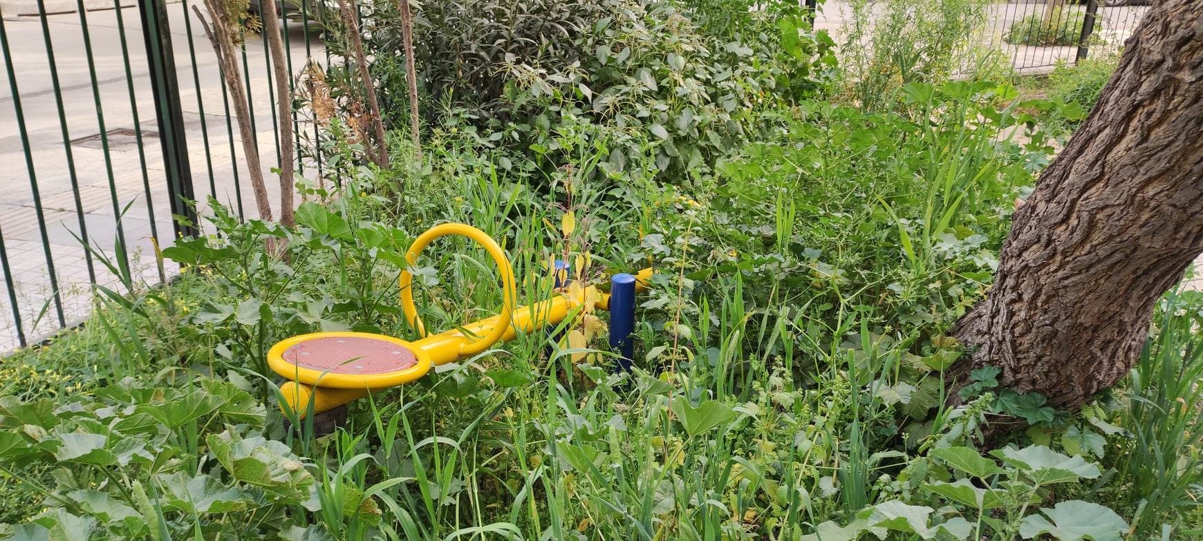 Εικόνα εγκατάλειψης στην παιδική χαρά στη συνοικία της Αγ. Μαρίνας στη Νέα Φιλαδέλφεια η οποία βρίσκεται στην διασταύρωση των οδών Σερρών και Ρεθύμνης. Είναι επίσης προφανές ότι η συγκεκριμένη εγκατάσταση δεν πλήρη τις απαιτούμενες προδιαγραφές που εξασφαλίζουν σε κάποιο βαθμό την αποφυγή ατυχήματος για τους μικρούς επισκέπτες.