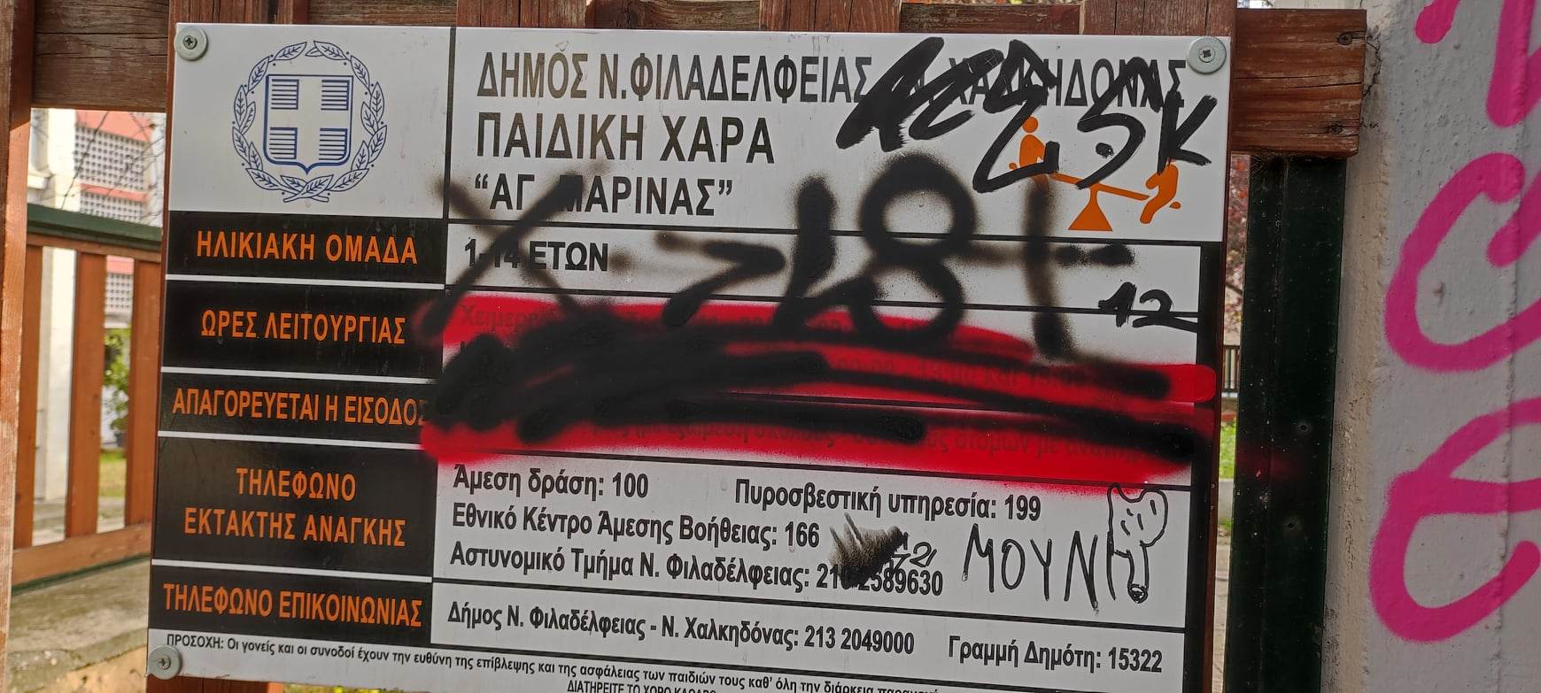 Πέρασε πάνω από ένας χρόνος που αρκετές παιδικές χαρές στο Δήμο Ν. Φιλαδέλφειας Ν. Χαλκηδόνας σφραγίσθηκαν λόγω ακαταλληλότητας. Αυτό συνέβη και στην παιδική χαρά που βρίσκεται μεταξύ της Λεωφ. Θεσσαλονίκης και της οδού Ηρακλείου στην συνοικία της Αγ. Μαρίνας Ν. Φιλαδέλφειας και συνεχίζει να παραμένει σφραγισμένη και εγκαταλελειμμένη.