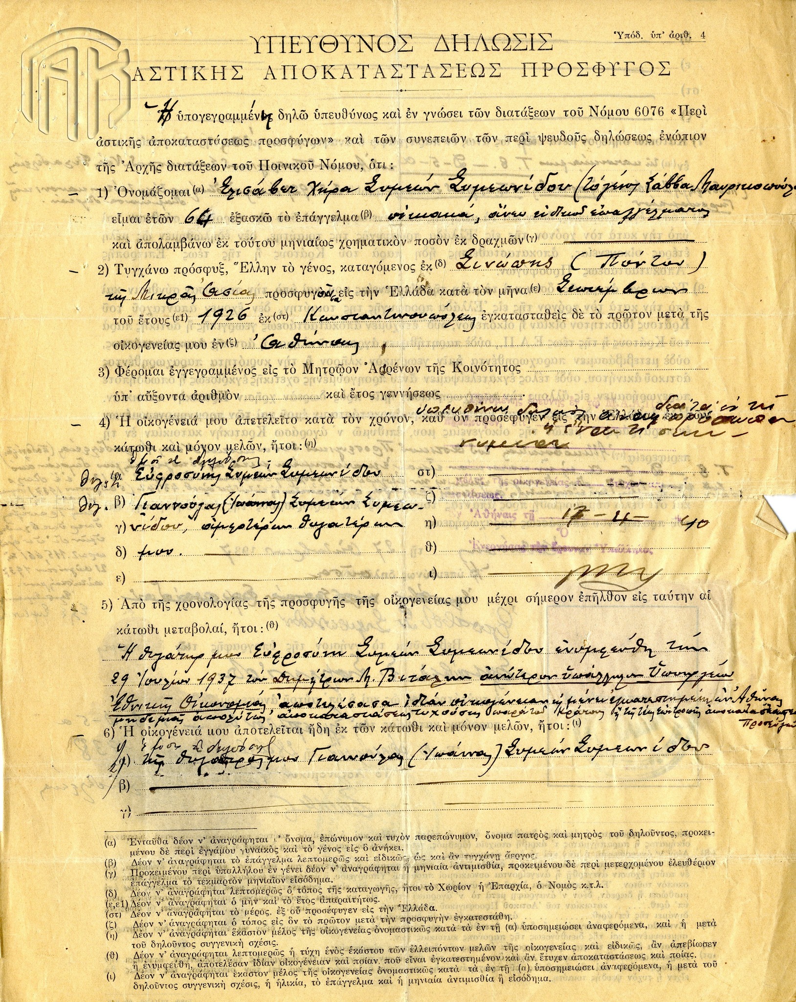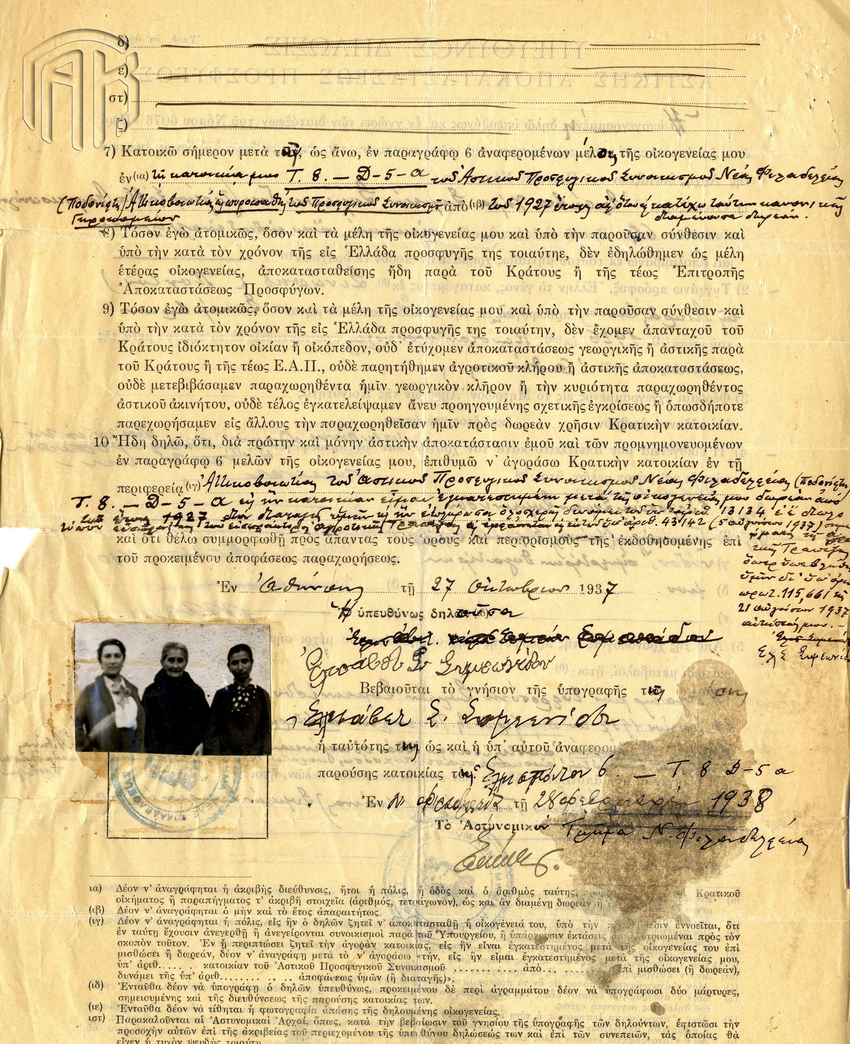 - Υπεύθυνη Δήλωση Αστικής Αποκατάστασης πρόσφυγα από τη Σινώπη του Πόντου, με την οποία δηλώνει την επιθυμία της να αγοράσει κρατική κατοικία στον Προσφυγικό Συνοικισμό Νέας Φιλαδελφείας (Ποδονίφτη), όπου εγκαταστάθηκε από το 1927.