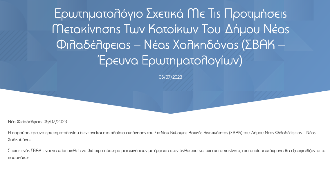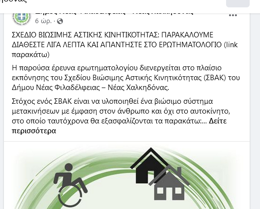 Με έκπληξη είδαμε στην επίσημη σελίδα του facebook του Δήμου Νέας Φιλαδέλφειας Ν. Χαλκηδόνας να γίνεται σήμερα 7/4/2024 ανάρτηση ερωτηματολογίου για την συλλογή πληροφοριών και στοιχείων για τη σύνταξη Σχεδίου Βιώσιμης Αστικής Κινητικότητας (Σ.Β.Α.Κ.), το οποίο είχε κυκλοφορήσει και πάλι σχεδόν ένα χρόνο πριν!!!
