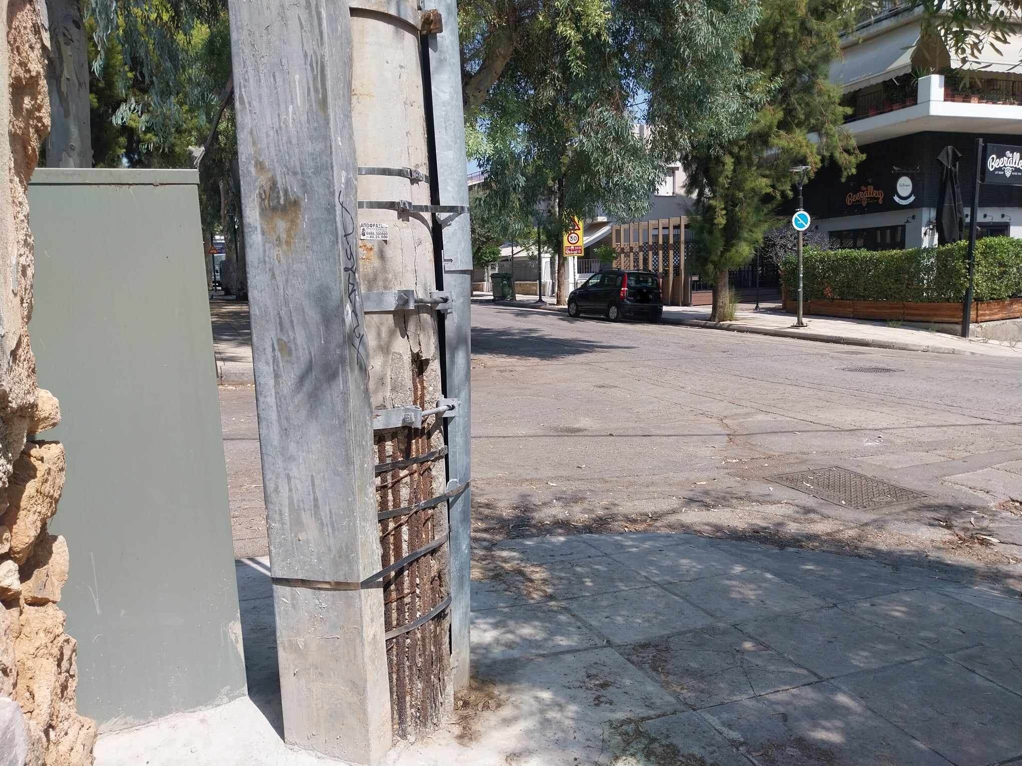 Δεκαοκτώ μήνες έχουν περάσει από προηγούμενο σχόλιο μας για την κατάσταση στύλου του ΔΕΔΗΕ στη διασταύρωση των οδών Σμύρνης και Πανόρμου, στην περιοχή “Σπαθάρη”. Φαίνεται ότι η σχετική “θεραπεία” δεν έχει φέρει αποτέλεσμα και για το λόγο αυτό παρατείνεται έτι περαιτέρω.