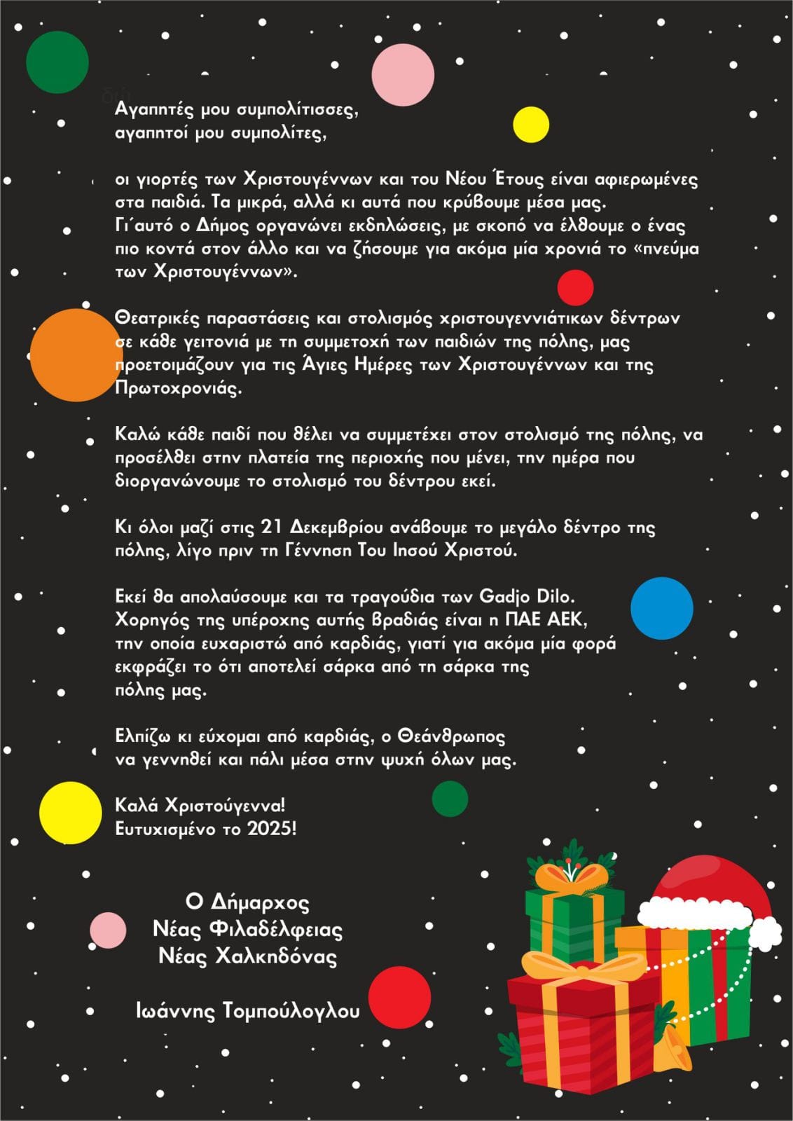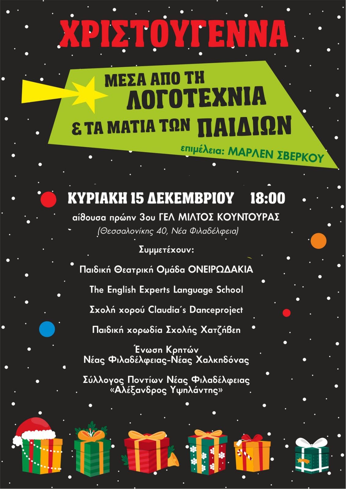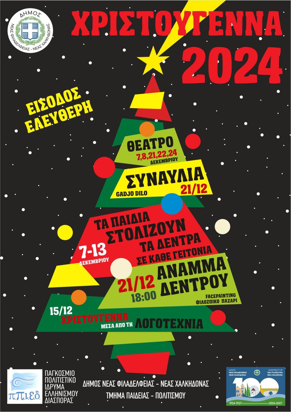 Στο πλαίσιο των εορταστικών εκδηλώσεων ο Δήμος Νέας Φιλαδέλφειας-Νέας Χαλκηδόνας έχει οργανώσει λογοτεχνικά και μουσικά αφιερώματα αλλά και θεατρικές παραστάσεις για μεγάλους και μικρούς, σε συνεργασία με τη θεατρική ομάδα της πόλης μας «Ονειρωδοί» και τα Ονειρωδάκια.