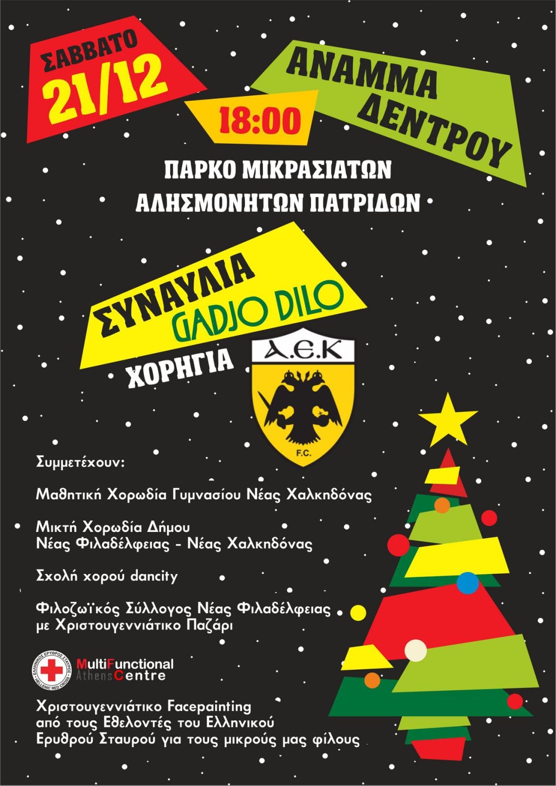 Το άναμμα του μεγάλου δέντρου της πόλης έχει προγραμματιστεί το Σάββατο 21 Δεκεμβρίου στο Πάρκο Μικρασιατών Αλησμόνητων Πατρίδων, όπου θα συμμετέχουν η Μαθητική Χορωδία του Γυμνασίου της Νέας Χαλκηδόνας, η Μικτή Χορωδία του Δήμου, η Σχολή χορού dancity, ο Φιλοζωϊκος Σύλλογος Νέας Φιλαδέλφειας με χριστουγεννιάτικο Παζάρι. Επίσης, το Πολυδύναμο Κέντρο Προσφύγων Αθήνας του Ελληνικού Ερυθρού Σταυρού θα βρίσκεται μαζί μας με διάθεση ενημερωτικού υλικού αναφορικά με τα προγράμματα ένταξης προσφύγων και μεταναστών του Τομέα Κοινωνικής Πρόνοιας του Ελληνικού Ερυθρού Σταυρού, με έκθεση με έργα της Ομάδας Γυναικών και της Ομάδας Νέων του Πολυδύναμου Κέντρου Προσφύγων Αθήνας, που έχουν δημιουργηθεί από ωφελούμενους στο πλαίσιο των ψυχοκοινωνικών δραστηριοτήτων τους και με Χριστουγεννιάτικο Facepainting από τους Εθελοντές του Ελληνικού Ερυθρού Σταυρού για τους μικρούς μας φίλους.