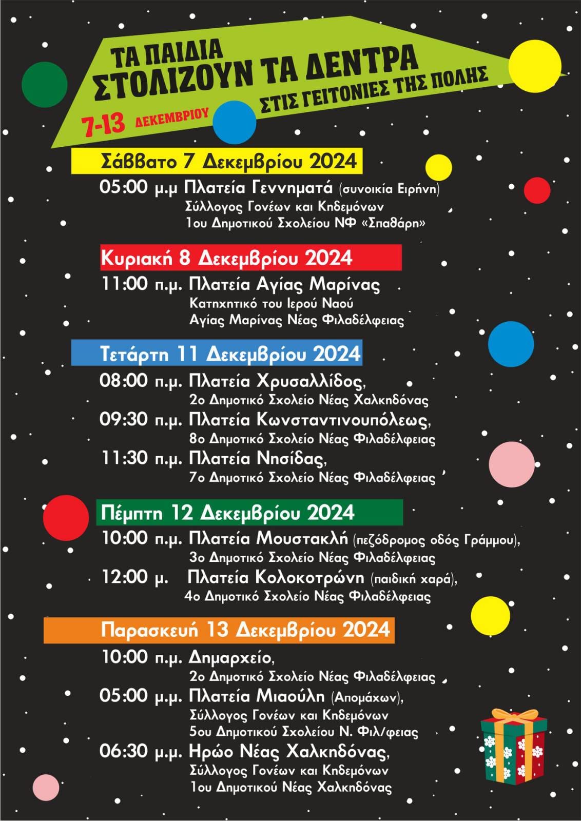 Για πρώτη φορά εισάγει ένα νέο θεσμό, τον στολισμό δέντρων στις πλατείες της πόλης από τα παιδιά. Συγκεκριμένα τοποθετήθηκαν, από τις Υπηρεσίες του Δήμου μας, δέκα φυσικά χριστουγεννιάτικα δέντρα στα εξής σημεία: Πλατεία Αγίας Μαρίνας, Πλατεία Γεννηματά (Συνοικία Ειρήνη), Πλατεία Κωνσταντινουπόλεως, Πλατεία Μουστακλή, Πλατεία Κολοκοτρώνη, Πλατεία Νησίδας, Πλατεία Μιαούλη, Πλατεία Χρυσαλλίδος, Ηρώο Νέας Χαλκηδόνας και στο Δημαρχείο, τα οποία θα στολιστούν με την συμμετοχή των Δημοτικών Σχολείων, των Συλλόγων Γονέων και Κηδεμόνων και του Κατηχητικού του Ιερού Ναού της Αγίας Μαρίνας σε συγκεκριμένες ημερομηνίες.