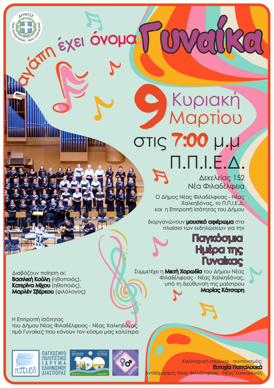 19:00 | Μουσικό αφιέρωμα «Η Αγάπη έχει Όνομα: Γυναίκα», στο Παγκόσμιο Πολιτιστικό Ίδρυμα Ελληνισμού της Διασποράς (Δεκελείας 152 & Ατταλείας 2, Νέα Φιλαδέλφεια).