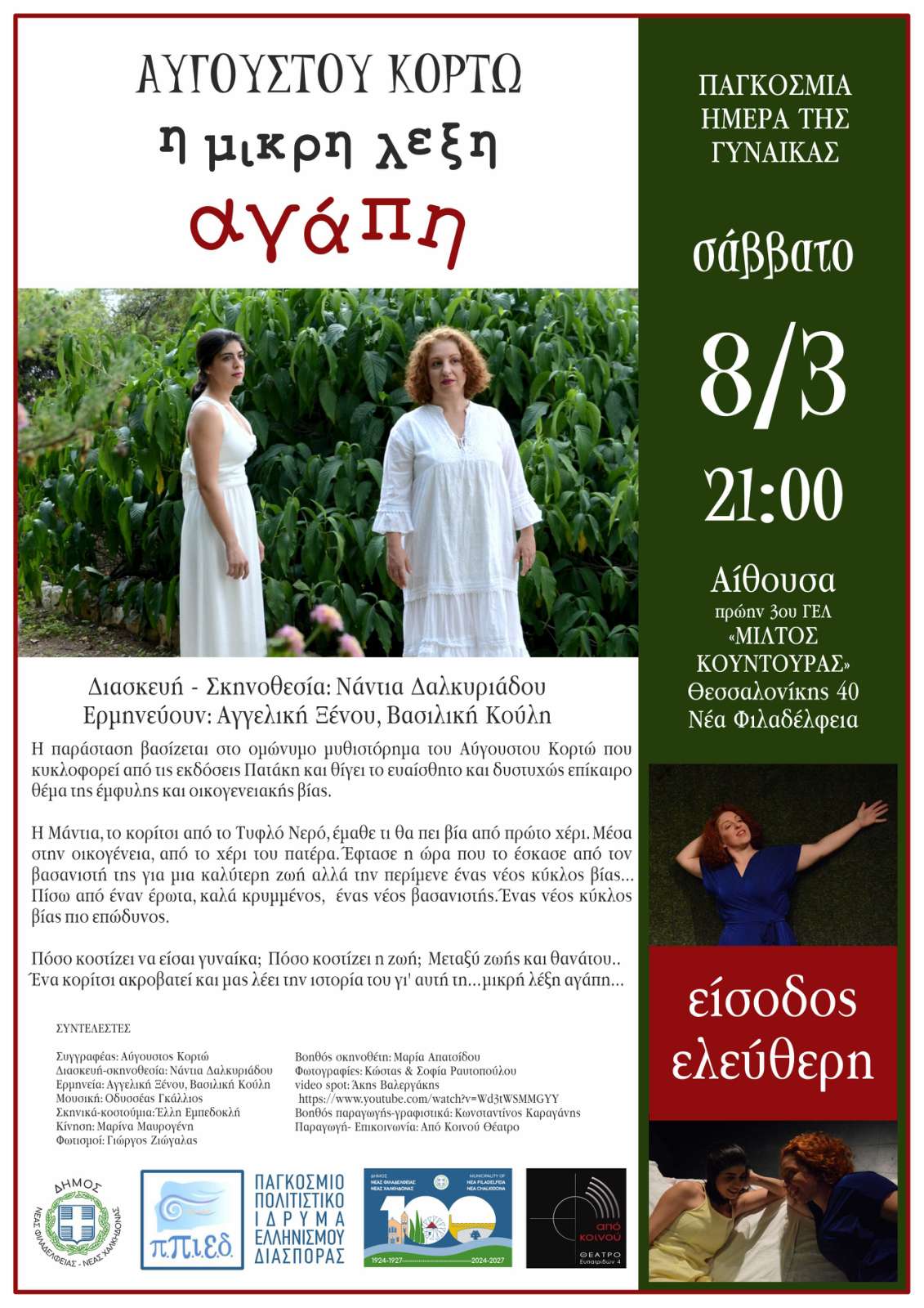 21:00 | Θεατρική παράσταση «Η μικρή λέξη αγάπη», στο πρώην 3ο ΓΕΛ «Μίλτος Κουντουράς», Θεσσαλονίκης 40, Νέα Φιλαδέλφεια.