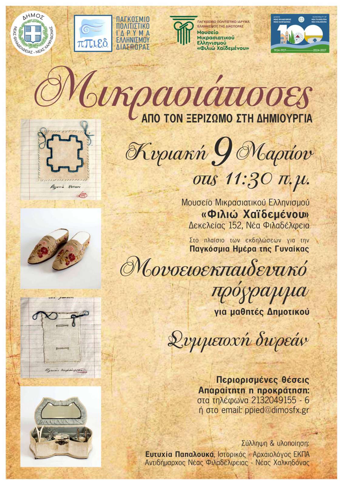 11:30 |«Μικρασιάτισσες: Από τον Ξεριζωμό στη Δημιουργία» Μουσειοεκπαιδευτικό πρόγραμμα για μαθητές Δημοτικού, στο Μουσείο Μικρασιατικού Ελληνισμού «Φιλιώ Χαϊδεμένου».