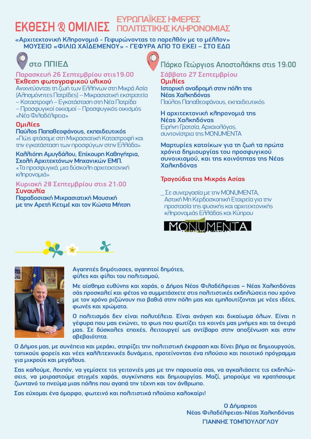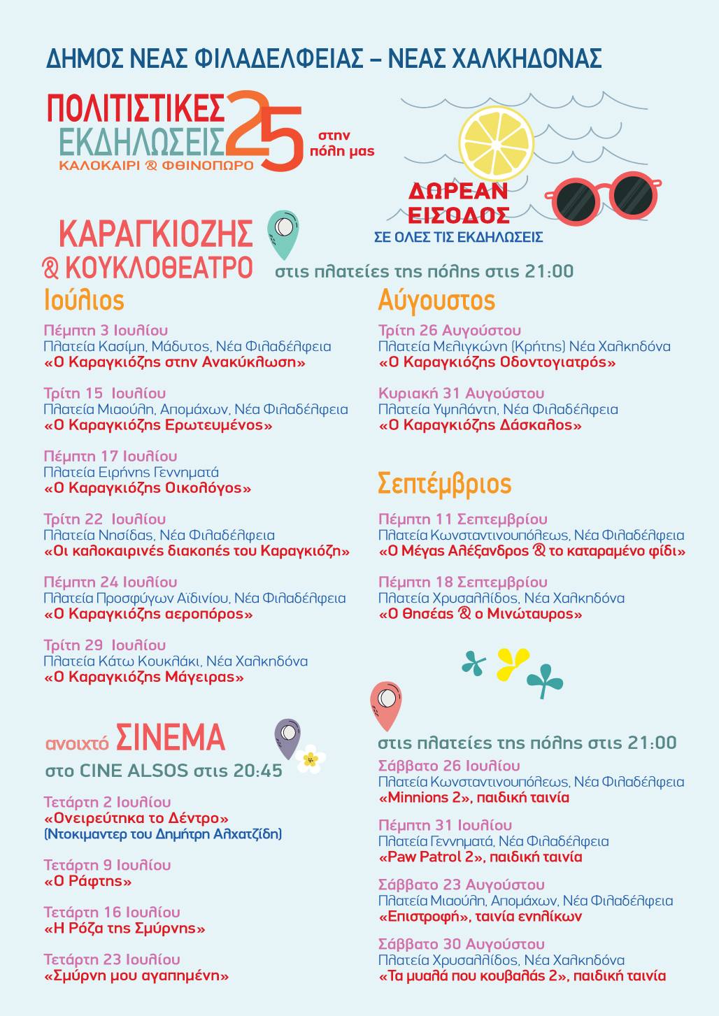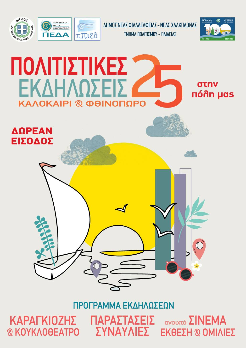 Δήμος Νέας Φιλαδέλφειας – Νέας Χαλκηδόνας ανακοίνωσε το πρόγραμμα των Πολιτιστικών Εκδηλώσεων για την περίοδο Καλοκαιριού & Φθινόπωρου 2025. Οι προγραμματισμένες εκδηλώσεις θα γίνουν σε διάφορα σημεία της πόλης με χαρακτηριστικό να περιλαμβάνονται σε αυτές 10 παραστάσεις Καραγκιόζη και 10 θεατρικές παραστάσεις για μικρούς αλλά και μεγάλους. Δύο Θεατρικές παραστάσεις χρηματοδοτούνται από την ΠΕΔΑ.