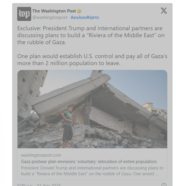 Από τη μια • Η Washington Post αποκάλυψε ένα αποκαλυπτικό σχέδιο 38 σελίδων που κυκλοφορεί στους κύκλους της κυβέρνησης Τραμπ και φέρει τον τίτλο «Gaza Reconstitution, Economic Acceleration and Transformation Trust – GREAT Trust». Στόχος είναι η πλήρης αναμόρφωση της Λωρίδας της Γάζας σε πολυτελές τουριστικό θέρετρο και βιομηχανικό κόμβο, με το προκλητικό σλόγκαν «από ένα κατεστραμμένο ιρανικό προτεκτοράτο σε έναν ευημερούντα αβρααμικό σύμμαχο».