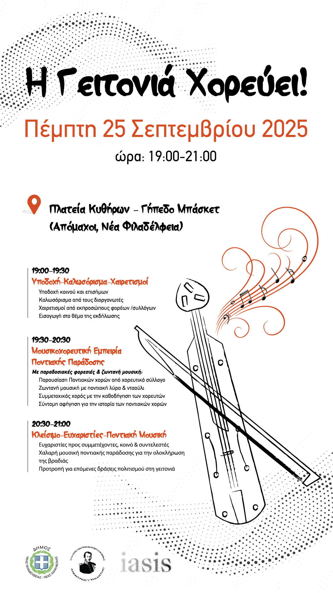 Η ΜΨΑ Άγιος Κοσμάς ,το CONNECT AUTISM της ΑμΚΕ ΙΑΣΙΣ και ο Σύλλογος Ποντίων Νέας Φιλαδέλφειας “Δημήτριος Υψηλάντης” σε συνεργασία με τον Δήμο Νέας Φιλαδέλφειας – Νέας Χαλκηδόνας, σας προσκαλούν στην εκδήλωση “Η γειτονιά χορεύει” στο ανακαινισμένο Γήπεδο Μπάσκετ στην Πλατεία Κυθήρων (περιοχή Απομάχων, Νέα Φιλαδέλφεια).