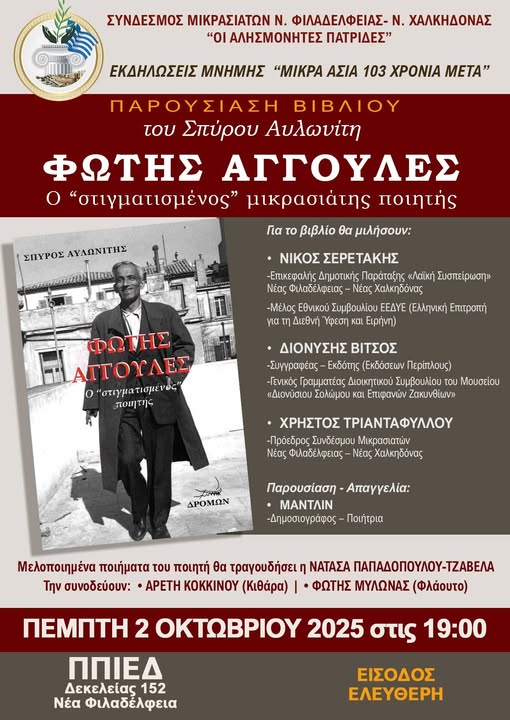 Ο Σύνδεσμος Μικρασιατών Νέας Φιλαδέλφειας – Νέας Χαλκηδόνας «ΟΙ ΑΛΗΣΜΟΝΗΤΕΣ ΠΑΤΡΙΔΕΣ» στο πλαίσιο των εκδηλώσεων μνήμης «ΜΙΚΡΑ ΑΣΙΑ 103 ΧΡΟΝΙΑ ΜΕΤΑ» σας προσκαλεί την ΠΕΜΠΤΗ 2 ΟΚΤΩΒΡΙΟΥ 2025 στις 19:00 στην παρουσίαση του βιβλίου του Σπύρου Αυλωνίτη: