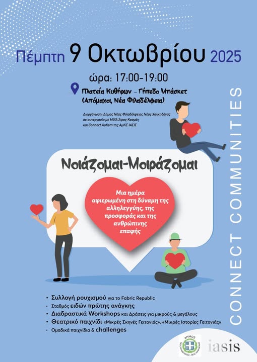 Ο Δήμος Νέας Φιλαδέλφειας – Νέας Χαλκηδόνας, σε συνεργασία με τη ΜΨΑ «Άγιος Κοσμάς» και το Connect Autism της ΑμΚΕ ΙΑΣΙΣ IASIS NGO, σας προσκαλεί σε μια όμορφη δράση αλληλεγγύης και προσφοράς με τίτλο «Νοιάζομαι & Μοιράζομαι».
