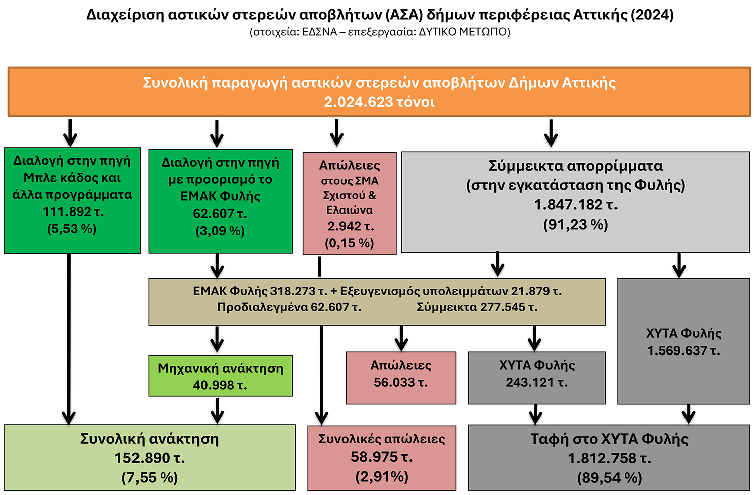 Το Δυτικό Μέτωπο έδωσε στη δημοσιότητα τα επεξεργασμένα στατιστικά στοιχεία της διαχείρισης των αστικών στερεών αποβλήτων (ΑΣΑ) για το 2024, βασισμένα στα επίσημα δεδομένα του ΕΔΣΝΑ. Η εικόνα, για μια ακόμη χρονιά, είναι απογοητευτική: η Περιφέρεια Αττικής εξακολουθεί να βρίσκεται πολύ πίσω στους στόχους ανακύκλωσης και αποκεντρωμένης διαχείρισης, γεγονός που την καθιστά –όπως αναφέρεται– «παράδειγμα προς αποφυγή».