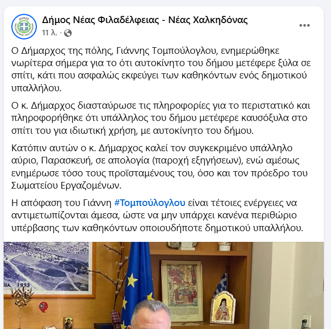Ένα απίστευτο περιστατικό προκάλεσε την οργή των κατοίκων της Νέας Φιλαδέλφειας: το πρωί της Πέμπτης, στην περιοχή Απομάχων, δημότισσα είδε μπροστά στα μάτια της φορτηγό του Δήμου να μπαίνει σε ιδιωτική κατοικία και υπάλληλο να ξεφορτώνει ξύλα στην αυλή. Το περιστατικό παρακολούθησαν αποσβολωμένοι και όσοι περίμεναν στη στάση του λεωφορείου.