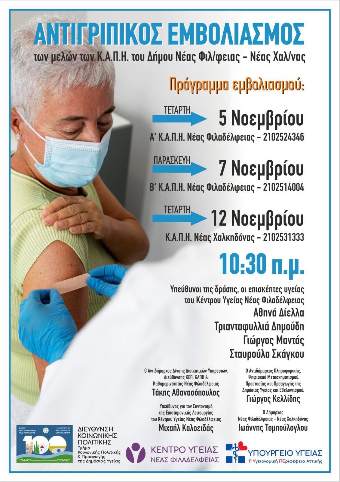 Ο Δήμος Νέας Φιλαδέλφειας – Νέας Χαλκηδόνας και το Τμήμα Κοινωνικής Πολιτικής & Προαγωγής της Δημόσιας Υγείας, σε συνεργασία με το Κέντρο Υγείας Νέας Φιλαδέλφειας, θα πραγματοποιήσει δωρεάν μαζικό αντιγριπικό εμβολιασμό για τα μέλη των τριών Κ.Α.Π.Η. του Δήμου μας.