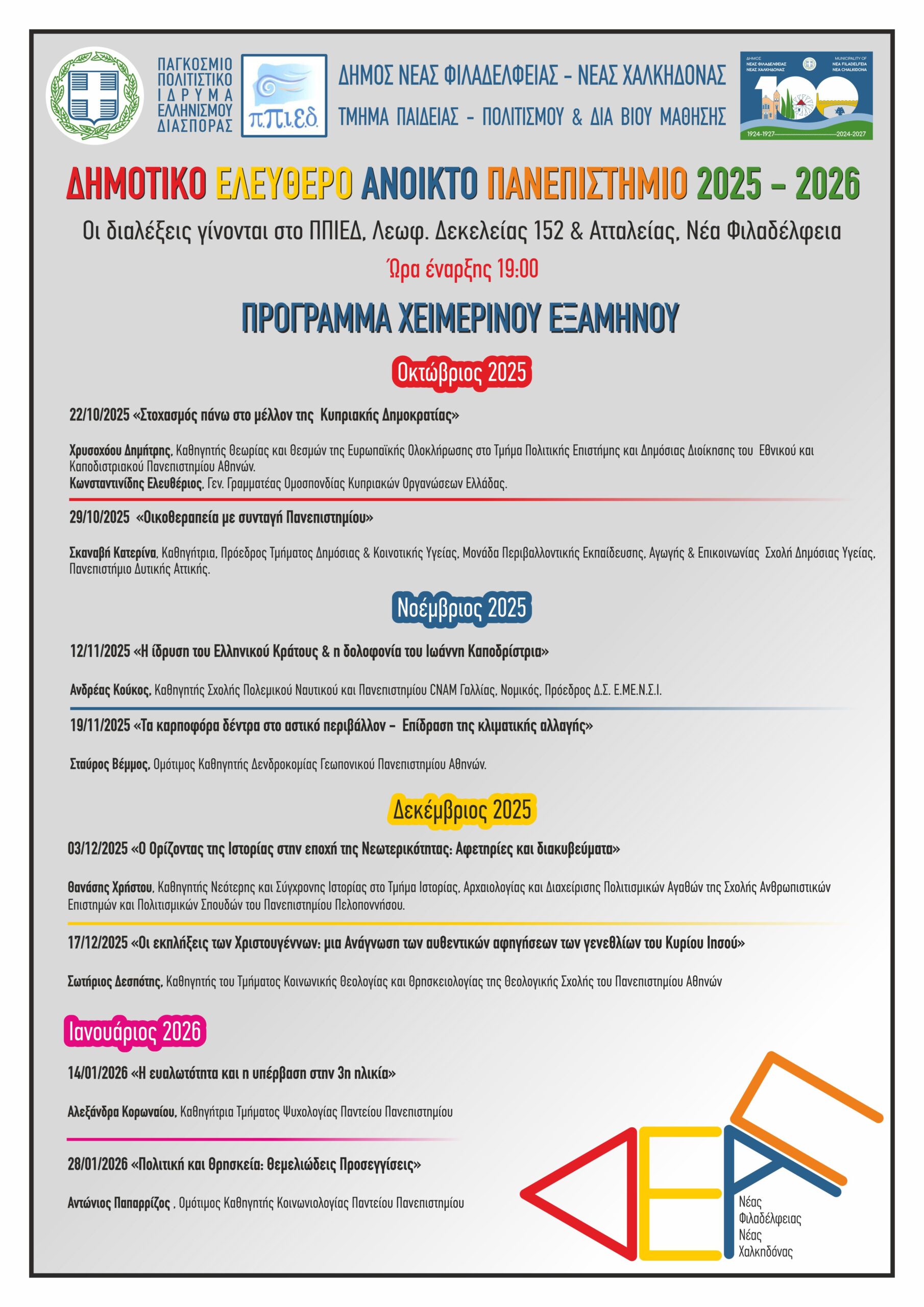 Συνεχίζονται οι διαλέξεις του Δημοτικού Ελεύθερου Ανοικτού Πανεπιστημίου Νέας Φιλαδέλφειας – Νέας Χαλκηδόνας.