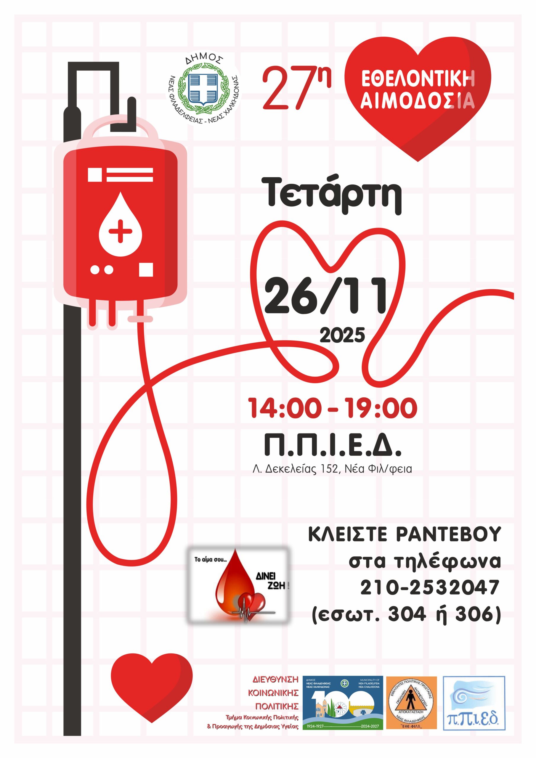 Η 27η Εθελοντική Αιμοδοσία θα πραγματοποιηθεί την Τετάρτη 26 Νοεμβρίου 2025 και ώρες 14:00 έως 18:30 στο Π.Π.Ι.Ε.Δ. (Λ. Δεκελείας 152 & Αττάλειας 2, Νέα Φιλαδέλφεια).