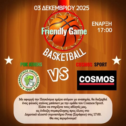 Η ομάδα μπάσκετ του Παναθλητικού Ομίλου Κωφών, με έδρα τη Νέα Φιλαδέλφεια, διοργανώνει έναν ξεχωριστό φιλικό αγώνα με την ομάδα Cosmos Sport την Τετάρτη 3 Δεκεμβρίου 2025 στις 17:00. Η αναμέτρηση θα πραγματοποιηθεί στο Δημοτικό Κλειστό Γυμναστήριο Ρουφ (Σεράφειο) και αποτελεί μια ευκαιρία για το κοινό να στηρίξει τους αθλητές σε έναν αγώνα γεμάτο φιλικό πνεύμα και αθλητική διάθεση.