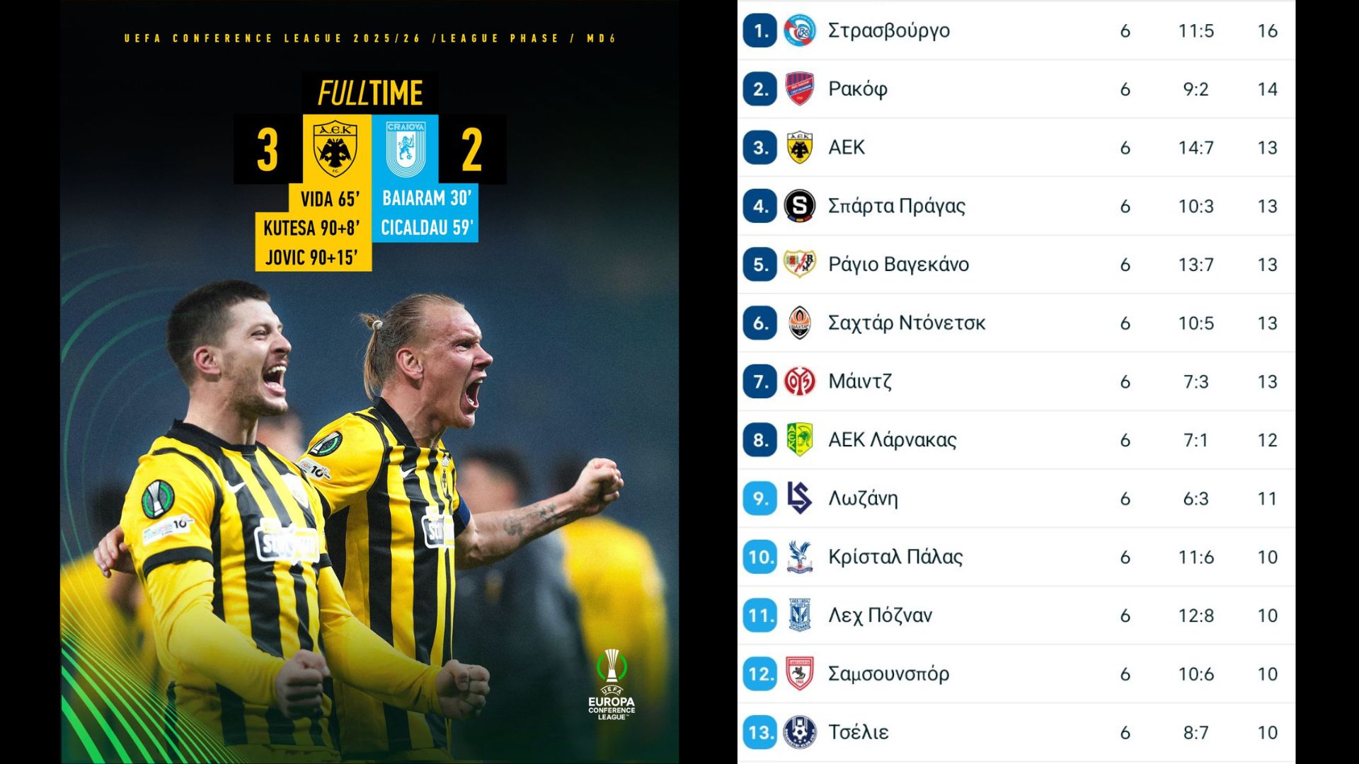 Μια από τις πιο συγκλονιστικές ευρωπαϊκές βραδιές της σύγχρονης ιστορίας της έζησε η ΑΕΚ το βράδυ της Πέμπτης, επικρατώντας με 3-2 της Κραϊόβα σε έναν αγώνα που τα είχε όλα: ένταση, λάθη, απογοήτευση, πίστη και στο τέλος… αποθέωση. Η Ένωση, με δύο γκολ στις καθυστερήσεις, γύρισε ένα χαμένο ματς και σφράγισε με δραματικό τρόπο την πρόκρισή της στους «16» του Conference League.