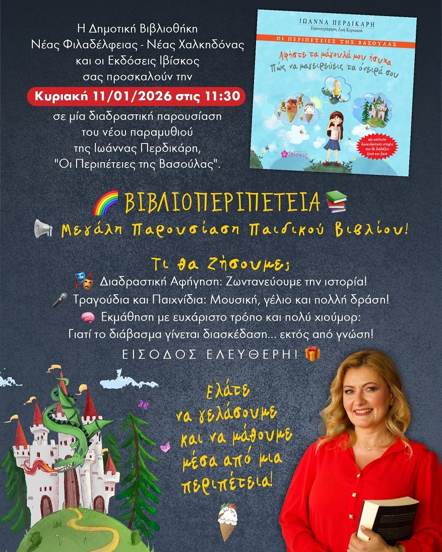 Επειδή η καλή χρονιά από την αρχή φαίνεται, η Δημοτική Βιβλιοθήκη Νέας Φιλαδέλφειας – Νέας Χαλκηδόνας μπαίνει δυναμικά στο 2026 με μια ξεχωριστή δράση για μικρούς και μεγάλους! Με ιδιαίτερη χαρά, σε συνεργασία με τις Εκδόσεις Ιβίσκος, σας προσκαλεί στην πρώτη παρουσίαση παιδικού βιβλίου για το νέο έτος.