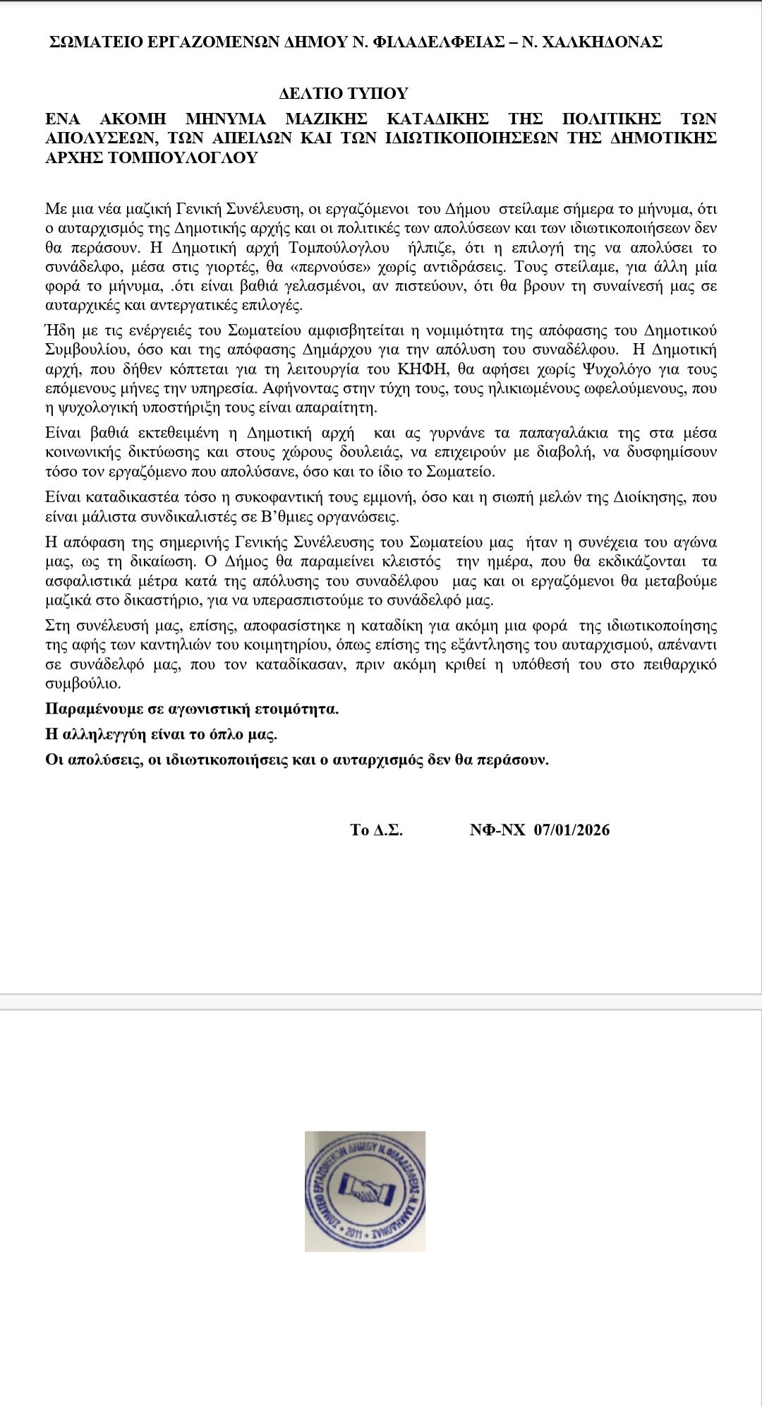 «Παραμένουμε σε αγωνιστική ετοιμότητα – η αλληλεγγύη είναι το όπλο μας», διαμηνύει το Σωματείο, ξεκαθαρίζοντας ότι οι απολύσεις, οι ιδιωτικοποιήσεις και ο αυταρχισμός δεν θα περάσουν σιωπηλά.