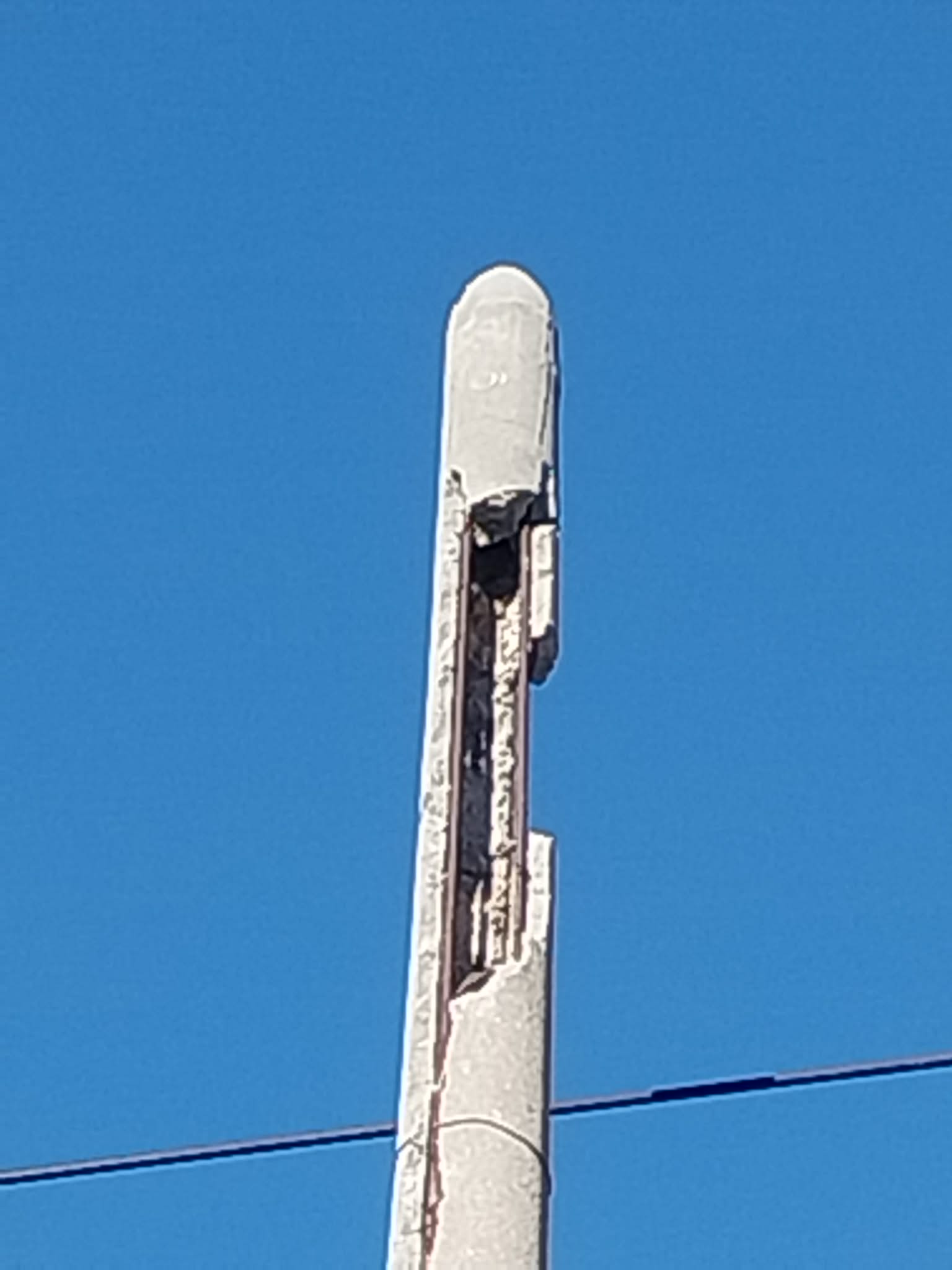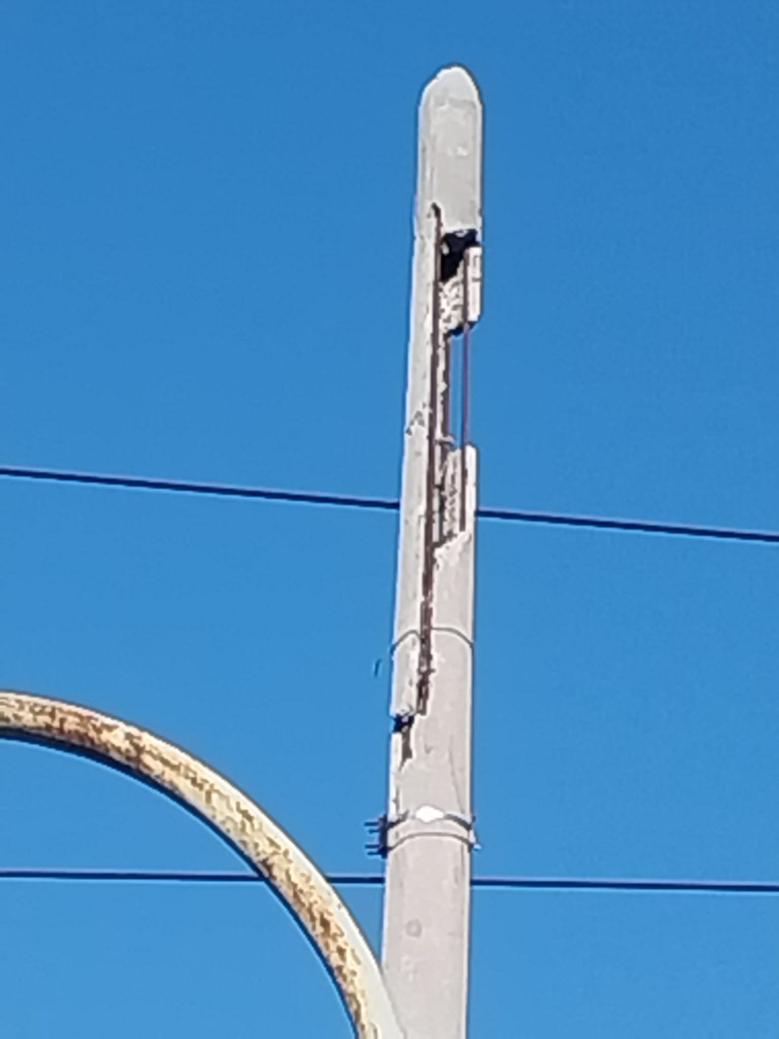 Η κολόνα κοινής ωφέλειας στο σημείο παρουσιάζει σοβαρότατες φθορές: το μπετό έχει σπάσει, μεγάλα κομμάτια σκυροδέματος έχουν ήδη αποκολληθεί, ενώ ο σιδερένιος οπλισμός είναι πλέον εκτεθειμένος και ορατός από απόσταση. Η εικόνα δεν αφήνει κανένα περιθώριο παρερμηνείας – πρόκειται για μια κατασκευή που καταρρέει σταδιακά, πάνω από κεφάλια πολιτών.