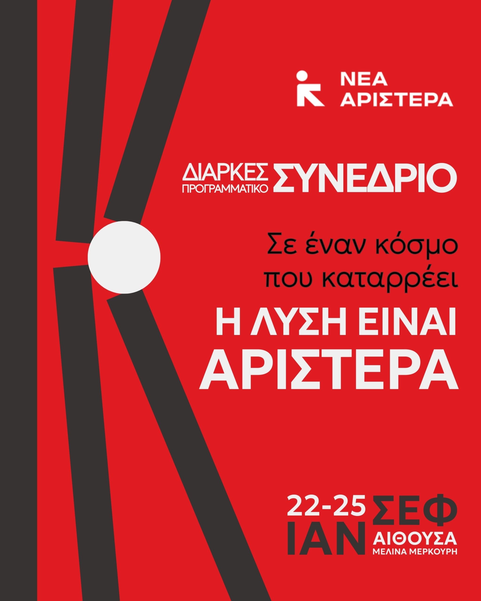 Από τις 22 έως και τις 25 Ιανουαρίου θα διεξαχθεί το Διαρκές – Προγραμματικό Συνέδριο της Νέας Αριστερά, στην αίθουσα Μελίνα Μερκούρη του Σταδίου Ειρήνης και Φιλίας.