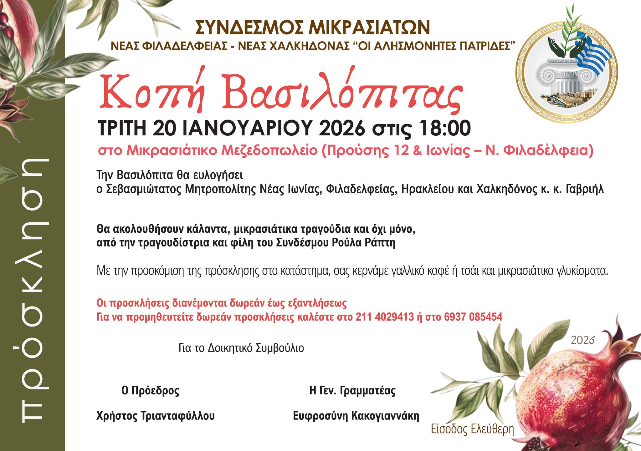 Ο Σύνδεσμος Μικρασιατών Νέας Φιλαδέλφειας – Νέας Χαλκηδόνας «Οι Αλησμόνητες Πατρίδες» προσκαλεί τα μέλη και τους φίλους του στην εκδήλωση κοπής της Πρωτοχρονιάτικης Βασιλόπιτας.