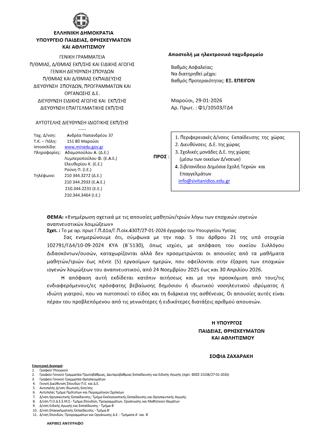 Δεν θα προσμετρώνται οι απουσίες μαθητών έως και πέντε (5) εργάσιμων ημερών που οφείλονται σε εποχικές ιογενείς λοιμώξεις του αναπνευστικού, σύμφωνα με εγκύκλιο του Υπουργείου Παιδείας που εστάλη σε όλες τις σχολικές μονάδες της χώρας.