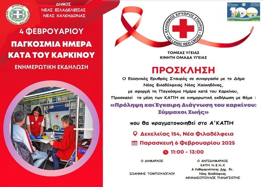 Ο Ελληνικός Ερυθρός Σταυρός (ΕΕΣ) και το Τμήμα Κοινωνικής Πολιτικής & Προαγωγής της Δημόσιας Υγείας του Δήμου Νέας Φιλαδέλφειας – Νέας Χαλκηδόνας με αφορμή την Παγκόσμια Ημέρα Κατά του Καρκίνου (4 Φεβρουαρίου), διοργανώνουν ενημερωτική εκδήλωση για τα μέλη των ΚΑΠΗ, με θέμα «Πρόληψη και Έγκαιρη Διάγνωση του Καρκίνου: Σύμμαχοι Ζωής».