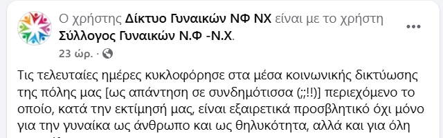 Το περιεχόμενο αυτό έχει προκαλέσει εύλογη αγανάκτηση και έντονο προβληματισμό σε πολλούς συνδημότες, οι οποίοι απευθύνθηκαν στο Δίκτυο Γυναικών ζητώντας δημόσια τοποθέτηση.