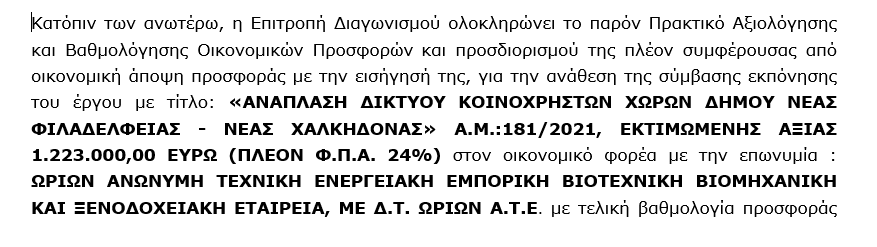 Μπροστά σε αυτά τα δεδομένα, η Δημοτική Επιτροπή καλείται να εγκρίνει τον προσωρινό ανάδοχο – την εταιρεία ΩΡΙΩΝ Α.Τ.Ε., με τελική προσφορά 1.208.873,13 ευρώ άνευ ΦΠΑ.