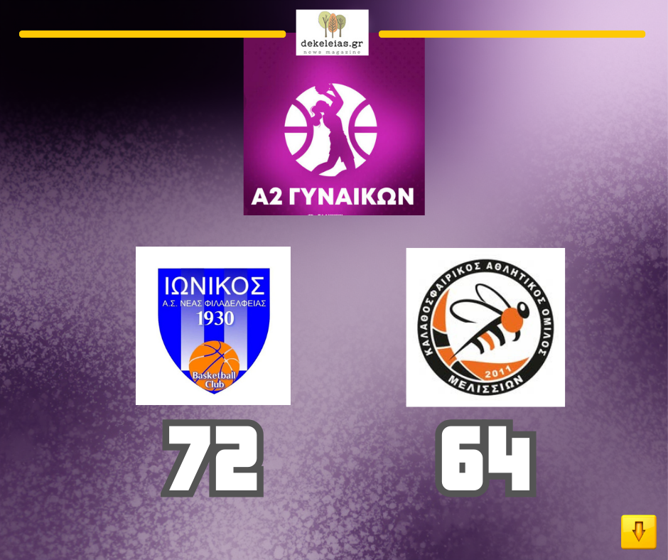 Ο Ιωνικός Ν. Φιλαδέλφειας πήρε από το πρώτο δεκάλεπτο τα ηνία του αγώνα απέναντι στον ΚΑΟ Μελισσίων, επιβάλλοντας τον ρυθμό του και χτίζοντας από νωρίς διαφορά, την οποία διατήρησε μέχρι το φινάλε. Με δυνατή άμυνα και σωστές επιλογές στην επίθεση, έκλεισε το ημίχρονο στο +11 (33-22) και δεν επέτρεψε στις φιλοξενούμενες να αμφισβητήσουν ουσιαστικά την κυριαρχία του, φτάνοντας στη νίκη με 72-64. Κορυφαίες για την ομάδα του Σκαλωμένου ήταν οι Σίντι με 20 πόντους και Τσιαδή με 19, ενώ από τον ΚΑΟ Μελισσίων ξεχώρισαν οι Κυρίδη και Κοιλιαρίδη. Διαιτητές της αναμέτρησης ήταν οι Μαυροειδής και Κυριακόπουλος.