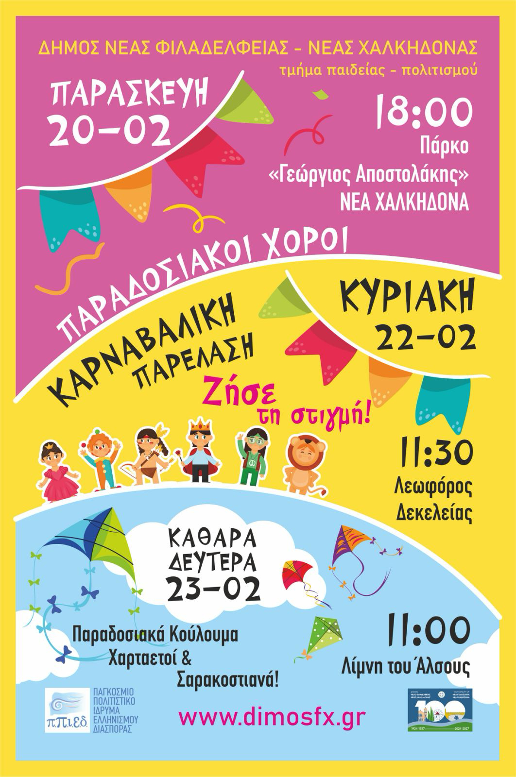 Για Τρίτη συνεχή χρονιά, Δήμος Νέας Φιλαδέλφειας – Νέας Χαλκηδόνας με επικεφαλής τον Γιάννη Τομπούλογλου επενδύει την βαθιά ανθρώπινη ανάγκη της τοπικής μας κοινωνίας να γιορτάσουμε μαζί, προσφέροντας για τις Απόκριες και την Καθαρά Δευτέρα, ένα ευφάνταστο εορταστικό πρόγραμμα, για μικρούς και μεγάλους, με μουσικοχορευτικές εκδηλώσεις, καρναβαλικά δρώμενα και παραδοσιακά έθιμα.