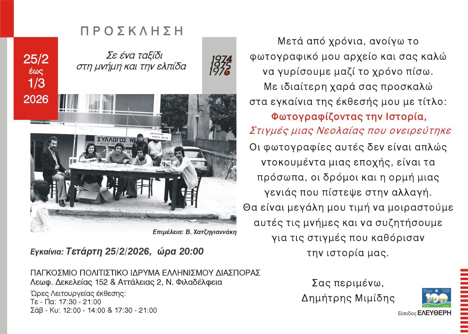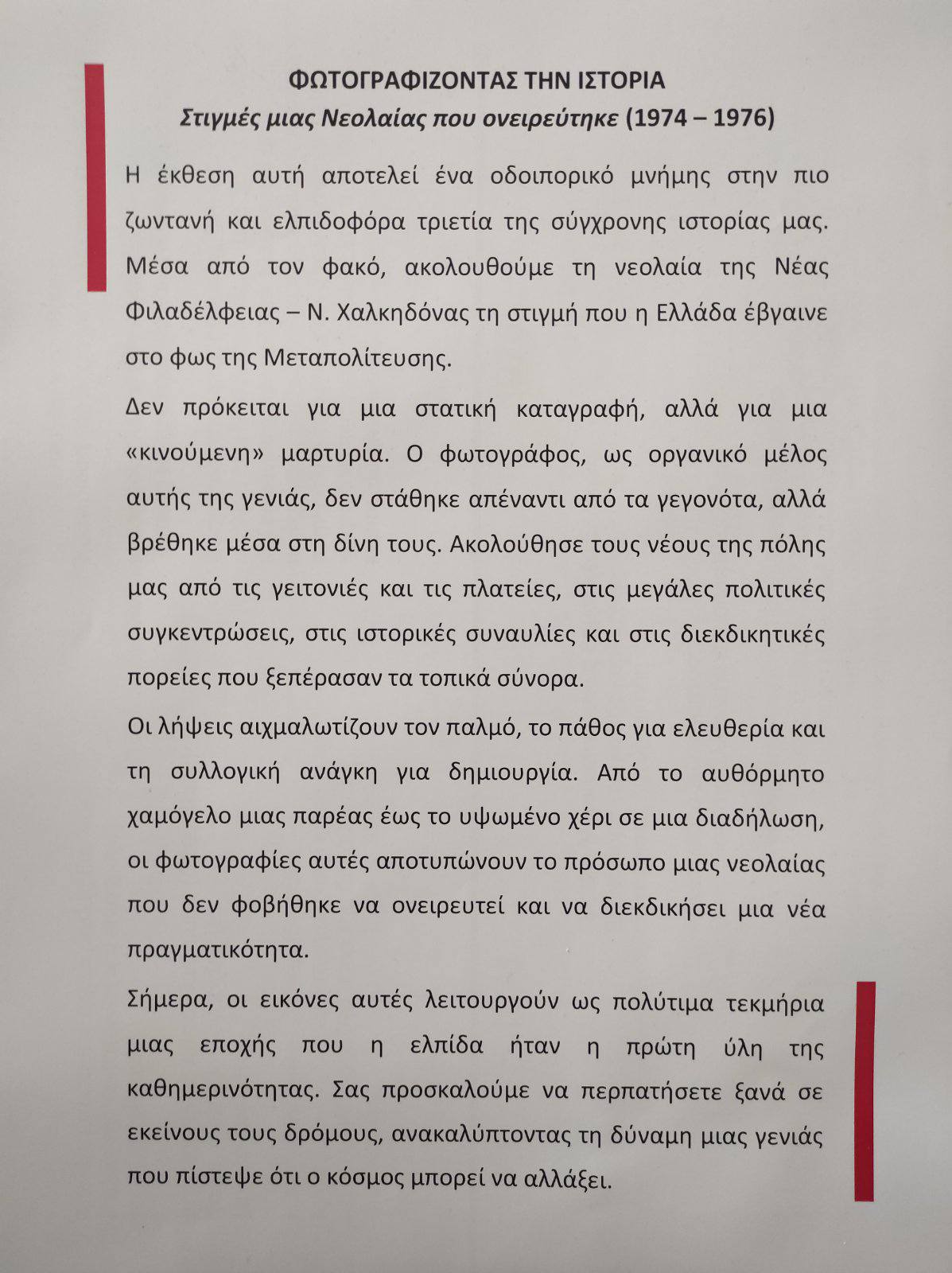 Πενήντα χρόνια μετά, ξεδιπλώνεται μπροστά μας μια σπάνια και προσωπική συλλογή φωτογραφιών που μας ταξιδεύει στην καρδιά της νεολαίας της Νέας Φιλαδέλφειας και της Νέας Χαλκηδόνας τη δεκαετία του ’70. Ο φωτογράφος, μέλος αυτής της γενιάς, ακολουθούσε τους νέους στα στέκια τους, στους συλλόγους, στις εκδρομές, στις πορείες για το Πολυτεχνείο, αλλά και στις πολιτικές νεολαίες. Κάθε εικόνα αιχμαλωτίζει το πάθος, τη δημιουργικότητα και την αφοσίωση μιας γενιάς που τόλμησε να ονειρευτεί και να διεκδικήσει τη ζωή που πίστευε ότι αξίζει.