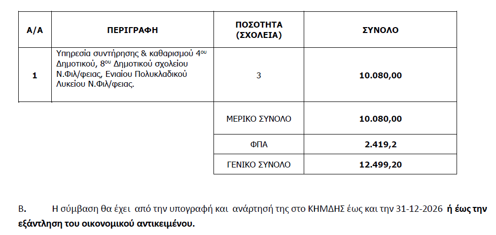 Τέσσερις μήνες αργότερα, τον Φεβρουάριο του 2026, με την απόφαση Αντιδημάρχου υπ’ αριθμ. 55/2026, ο Δήμος Νέας Φιλαδέλφειας Νέας Χαλκηδόνας προχώρησε σε απευθείας ανάθεση σε ιδιωτική εταιρεία για υπηρεσίες με τίτλο: «ΥΠΗΡΕΣΙΕΣ ΣΥΝΤΗΡΗΣΗΣ & ΚΑΘΑΡΙΣΜΟΥ ΣΧΟΛΙΚΩΝ ΜΟΝΑΔΩΝ ΔΗΜΟΥ». Ωστόσο στην σχετική απόφαση ανάληψης υποχρέωσης (ΑΑΥ 1731/2025) το έργο περιγράφεται ως: