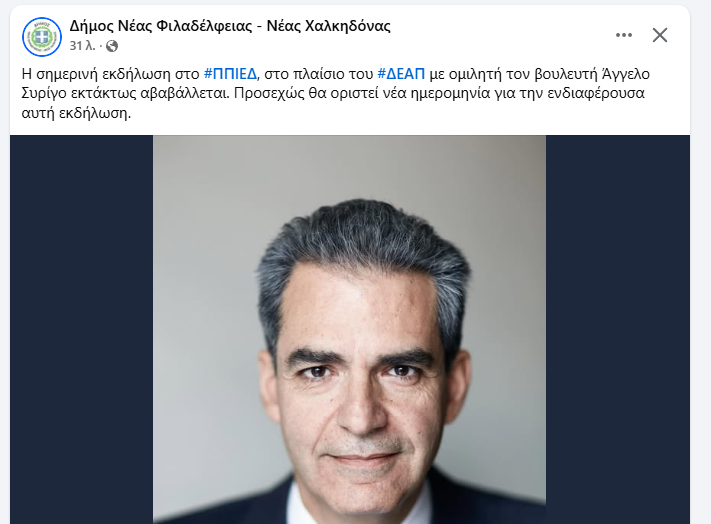 Με μια λιτή ανακοίνωση ο Δήμος Νέας Φιλαδέλφειας – Νέας Χαλκηδόνας γνωστοποίησε την αναβολή της προγραμματισμένης για σήμερα 4/3/26 διάλεξης του βουλευτή της Νέας Δημοκρατίας Άγγελου Συρίγου στο πλαίσιο του Δημοτικού Ελεύθερου Ανοιχτού Πανεπιστημίου. Καμία αιτιολογία δεν δόθηκε. Όμως, όταν μια αναβολή έρχεται μετά από δεκάδες δημόσιες παρεμβάσεις, αιχμηρά σχόλια και συγκεκριμένα ερωτήματα πολιτών, είναι προφανές τι μεσολάβησε.