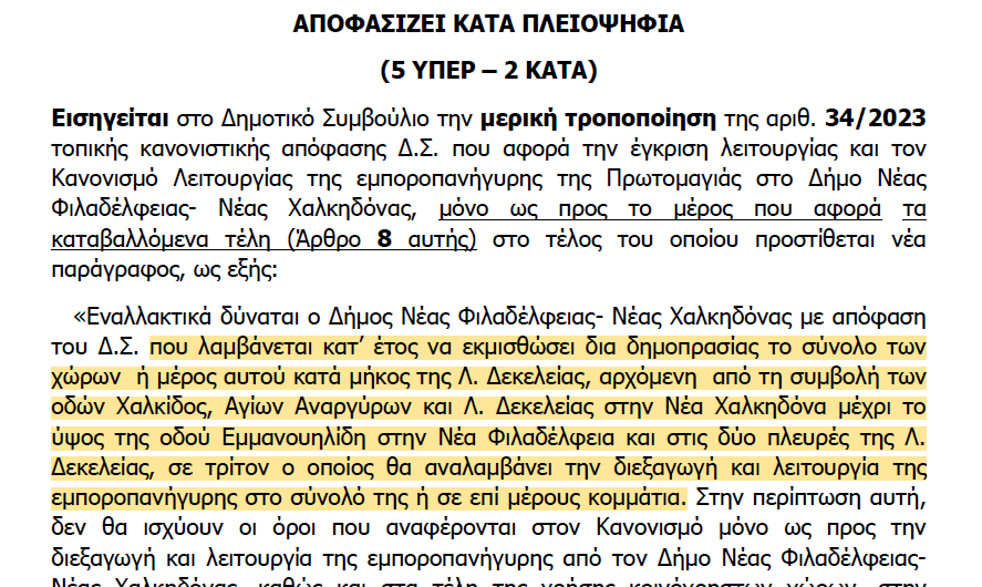Παράλληλα, το μοντέλο αλλάζει και οικονομικά: αντί ο Δήμος να καθορίζει τέλος χρήσης κοινοχρήστου χώρου για τους συμμετέχοντες, ενδέχεται να εισπράττει ένα συνολικό τίμημα από τον ανάδοχο που θα αναλάβει τη διοργάνωση.