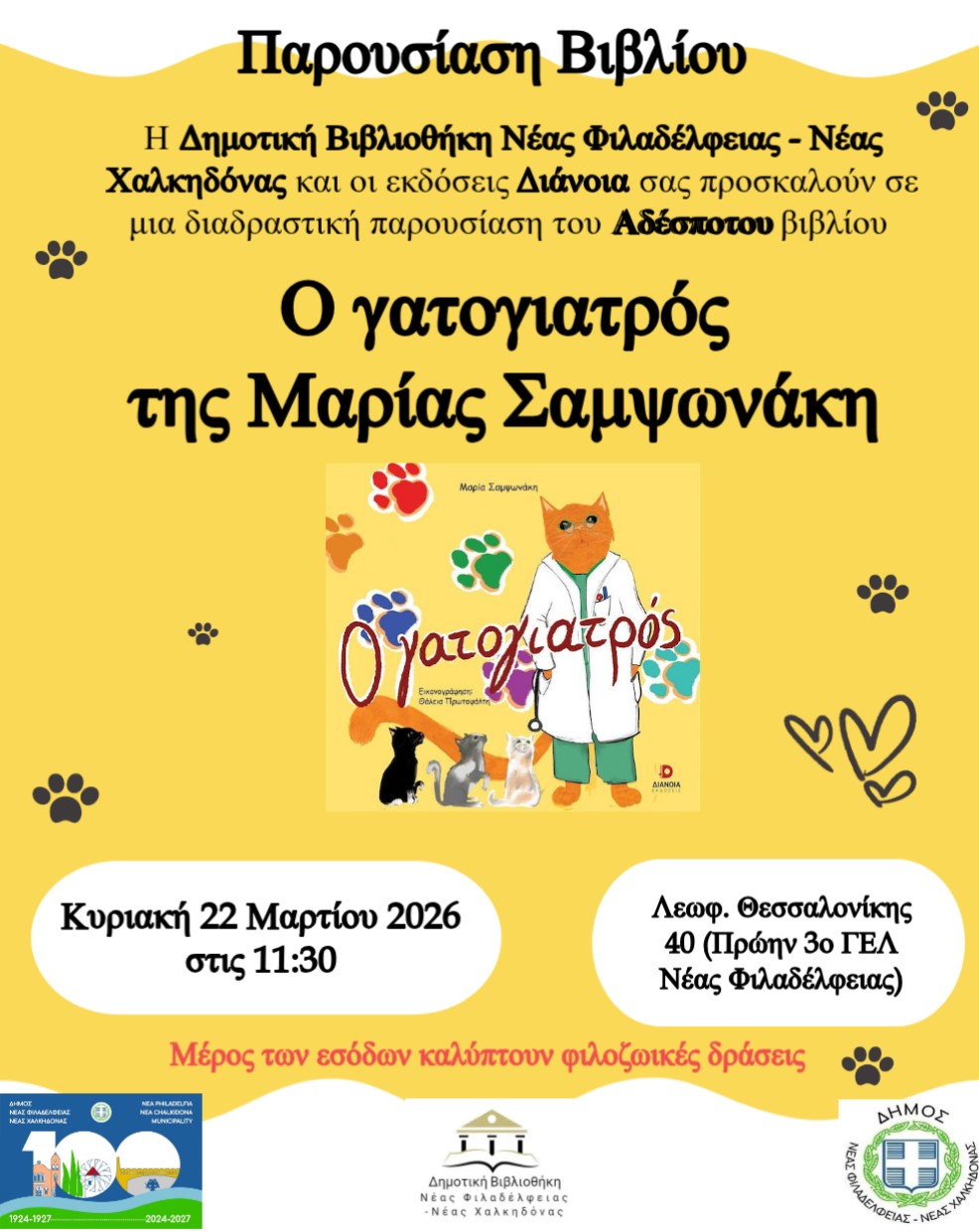 H Δημοτική Βιβλιοθήκη Νέας Φιλαδέλφειας – Νέας Χαλκηδόνας με ιδιαίτερη χαρά συνεργάζεται με τις Εκδόσεις Διάνοια και σας προσκαλούν σε μια διαδραστική παρουσίαση του… αδέσποτου βιβλίου «Ο γατογιατρός» της Μαρίας Σαμψωνάκη, την Κυριακή 22 Μαρτίου 2026 στις 11:30 στο χώρο της Δημοτικής Βιβλιοθήκης (Θεσσαλονίκης 40 – Πρώην 3ο ΓΕΛ Νέας Φιλαδέλφειας «Μίλτος Κουντουράς»).