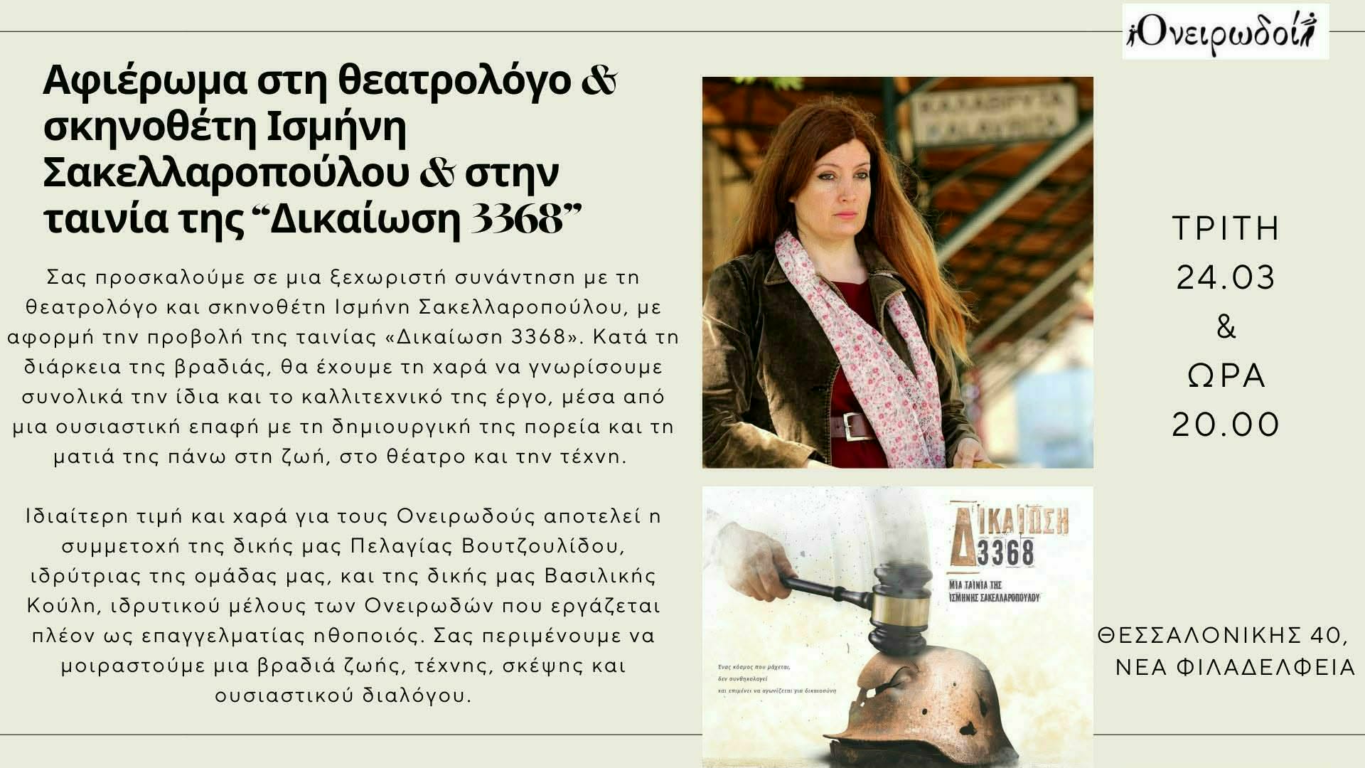 Μια ξεχωριστή πολιτιστική εκδήλωση θα πραγματοποιηθεί την Τρίτη 24 Μαρτίου στις 20:00, στη Νέα Φιλαδέλφεια (Θεσσαλονίκης 40), με επίκεντρο τη θεατρολόγο και σκηνοθέτη Ισμήνη Σακελλαροπούλου και το έργο της.