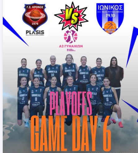 Λόγω κωλύματος του γηπέδου και μετά από συμφωνία των δύο Σωματείων, ο αγώνας ΓΣ Κρόνος Αγ. Δημητρίου – Ιωνικός ΑΣ Ν. Φιλαδέλφειας, για την 6η αγωνιστική των playoffs (1 – 3 Α’ και Β’ Υποόμιλος) του Πρωταθλήματος της Α2 Εθνικής κατηγορίας Γυναικών (1ος Όμιλος), αντί της 01/04/2026 και ώρα 21.15, θα διεξαχθεί στις 04/04/2026 και ώρα 18.00, στο Κλειστό Γυμναστήριο Αγ. Δημητρίου (ΝΕΟ).