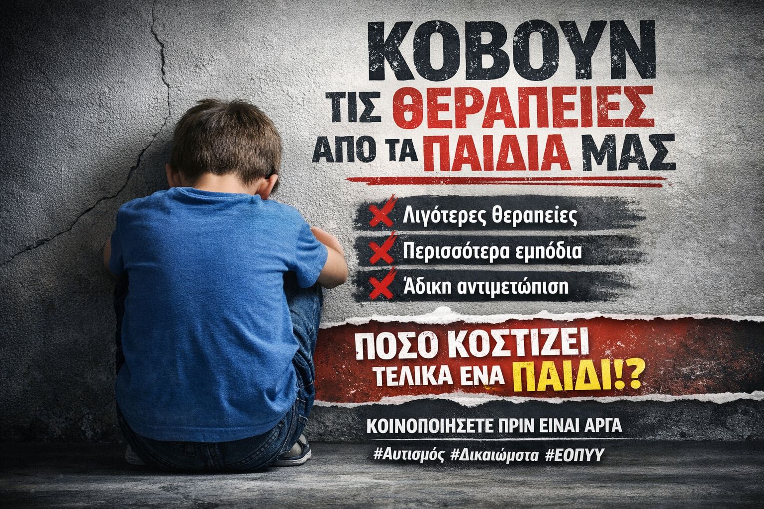 Υπάρχει μια ομάδα στο facebook που λέγεται Διαταραχές Αυτιστικού Φάσματος (https://www.facebook.com/groups/179225488912239) όπου γονείς με παιδιά στο φάσμα του αυτισμού ανταλλάσσουν εμπειρίες, πληροφορίες, απόψεις. Ένας κόσμος που αγωνίζεται για τα άτομα με αυτισμό και αντιμετωπίζει ένα σωρό προβλήματα, όπως φαίνεται και στην εικόνα που άντλησα από τη σελίδα αυτή. Όπως διάβασα «με πρόσφατες αποφάσεις του ΕΟΠΥΥ μειώνονται οι θεραπείες, μπαίνουν περισσότερα εμπόδια, τα παιδιά μας πληρώνουν το τίμημα».