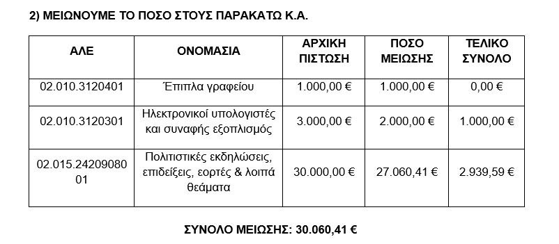 Συγκεκριμένα, το κονδύλι για «Πολιτιστικές εκδηλώσεις, επιδείξεις, εορτές και λοιπά θεάματα» μειώνεται από 30.000 ευρώ σε μόλις 2.939,59 ευρώ, δηλαδή κατά 27.060,41 ευρώ. Παράλληλα, μειώνονται και οι πιστώσεις για εξοπλισμό, όπως έπιπλα γραφείου και ηλεκτρονικούς υπολογιστές.