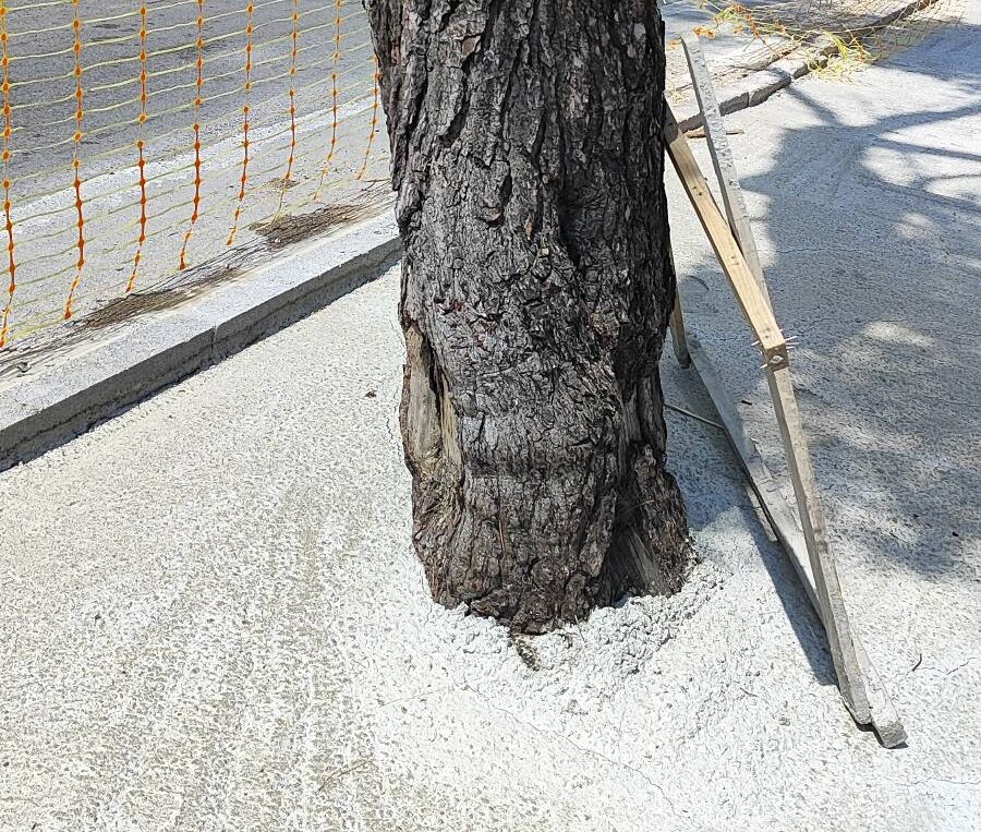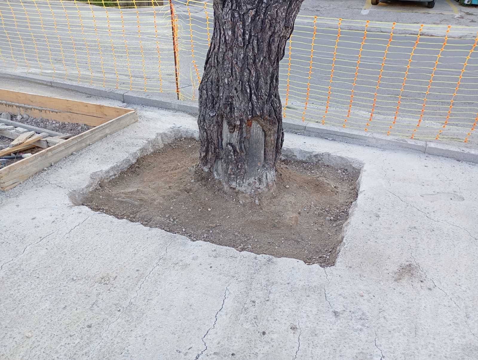Ωστόσο, λίγο αργότερα, ξεκίνησε μια άλλη πρακτική: τα πεύκα άρχισαν να τσιμεντώνονται μέχρι τον κορμό τους. Μια πρακτική που ισοδυναμεί με αργό θάνατο των δέντρων, καθώς χωρίς οξυγόνο και επαρκή απορροή νερού, τα πεύκα οδηγούνται με μαθηματική ακρίβεια στην ξήρανση.